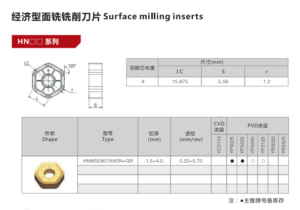 | YP3225 | 2-4um AlCr + AlCrSiN PVD涂層,結合超細顆粒基體,具有高耐磨性,適用于熱處理鋼、不銹鋼和淬火鋼的精加工和半精加工 | P10-P25 K15-K30 M10-M25 |