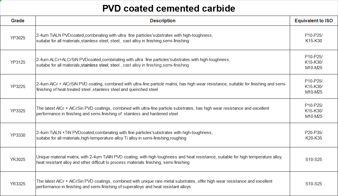 | YP3225 | 2-4um AlCr + AlCrSiN PVD涂層,結合超細顆粒基體,具有高耐磨性,適用于熱處理鋼、不銹鋼和淬火鋼的精加工和半精加工 | P10-P25 K15-K30 M10-M25 |
